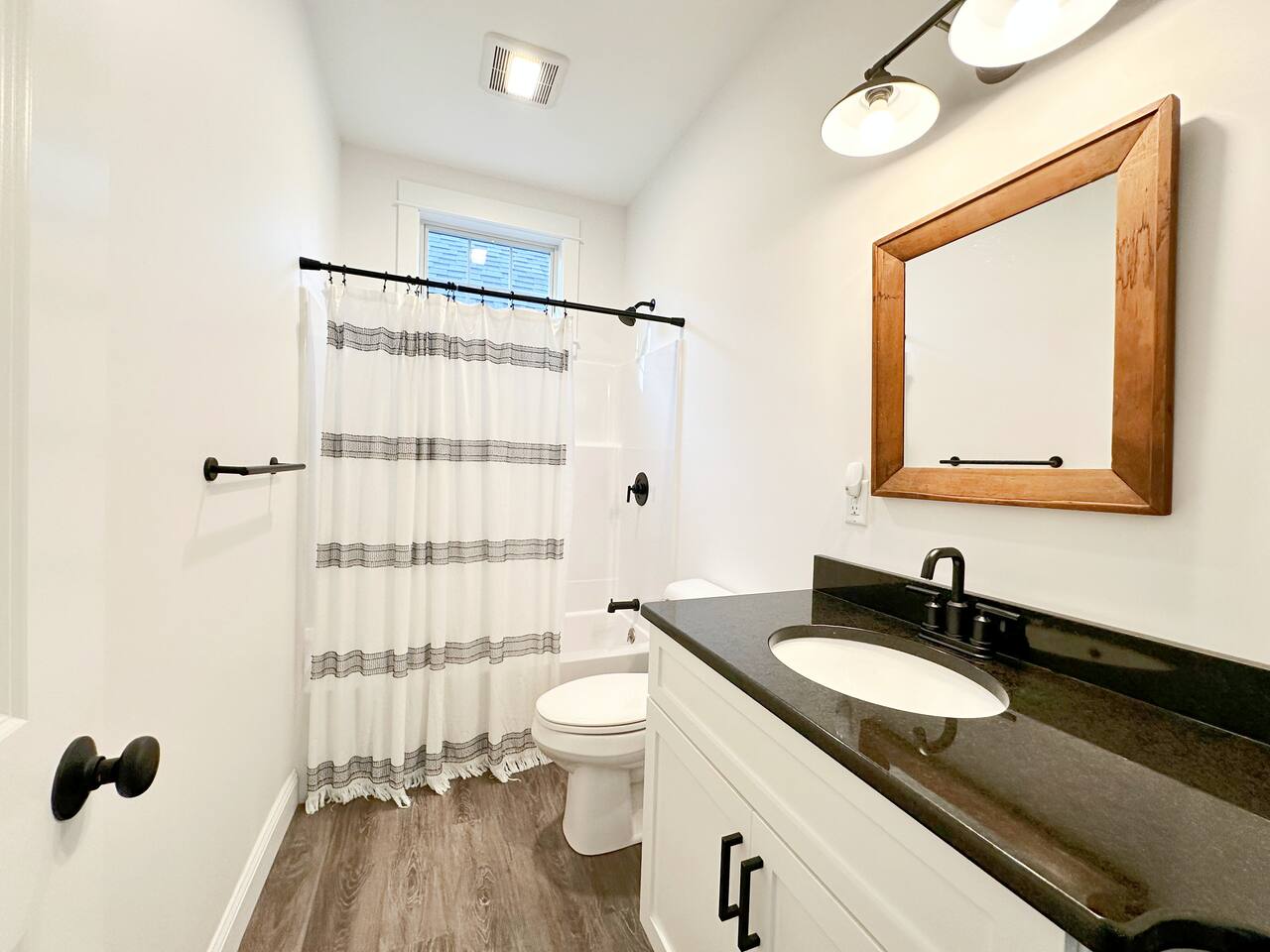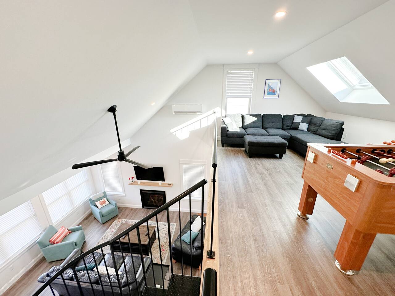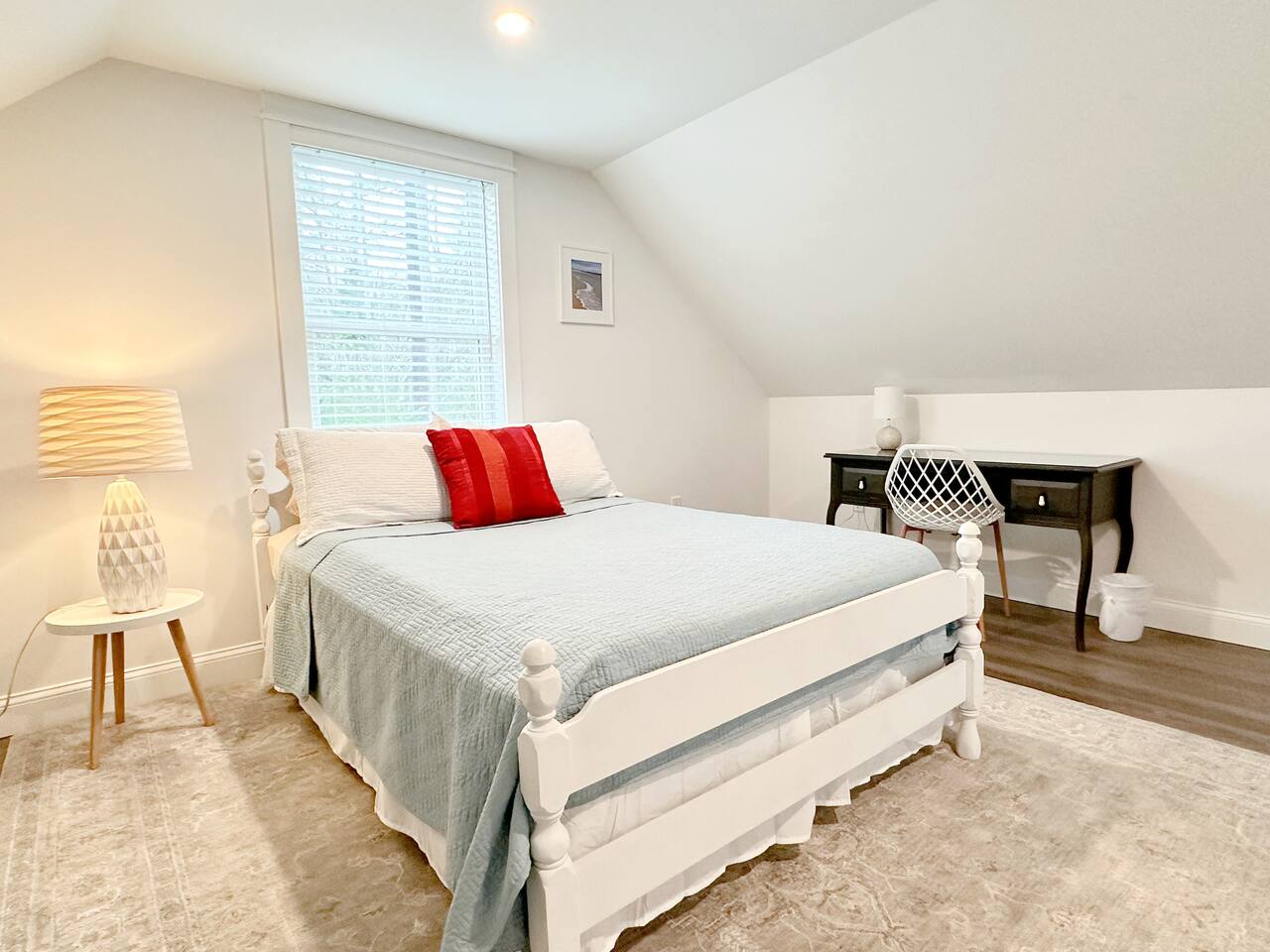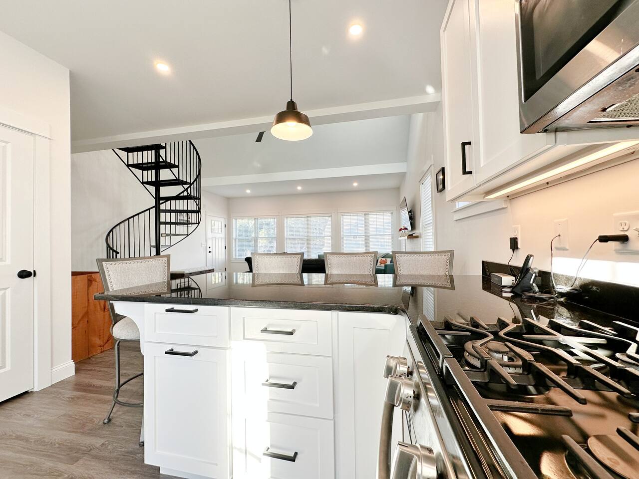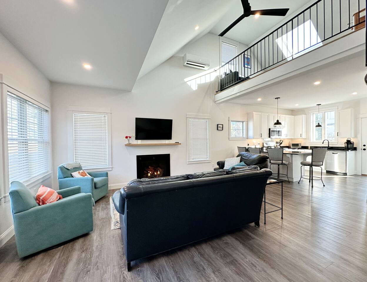 The kitchen is well equipped with all the amenities needed to feel right at home. The open living space welcomes social gatherings with friends and family and the gas fireplace makes things warm and cozy on those chilly nights. There are a total of 3 bedrooms. The downstairs queen bedroom is perfect for guests who like first floor living with easy access to an 'en suite full size spa bathroom. The second bedroom offers 2 twin beds, perfect for the kids or adults alike. The second full bathroom is also on the first floor just outside the twin bedroom. The upstairs offers another queen bedroom in a private and comfortable, space for those who want a little more privacy. Enjoy bbq's on the backyard patio or take a dip in the pool which is a short walk away from the cottage.